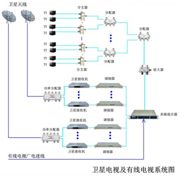 衛星電視節目頻道根據實際情況選擇衛星接收電視節目內容,通過調制、解調后混合輸入傳輸干線。